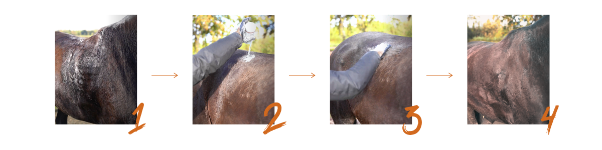 Trockenshampoo auf das verschwitzte Pferd geben, einmassieren, ausbürsten - fertig!