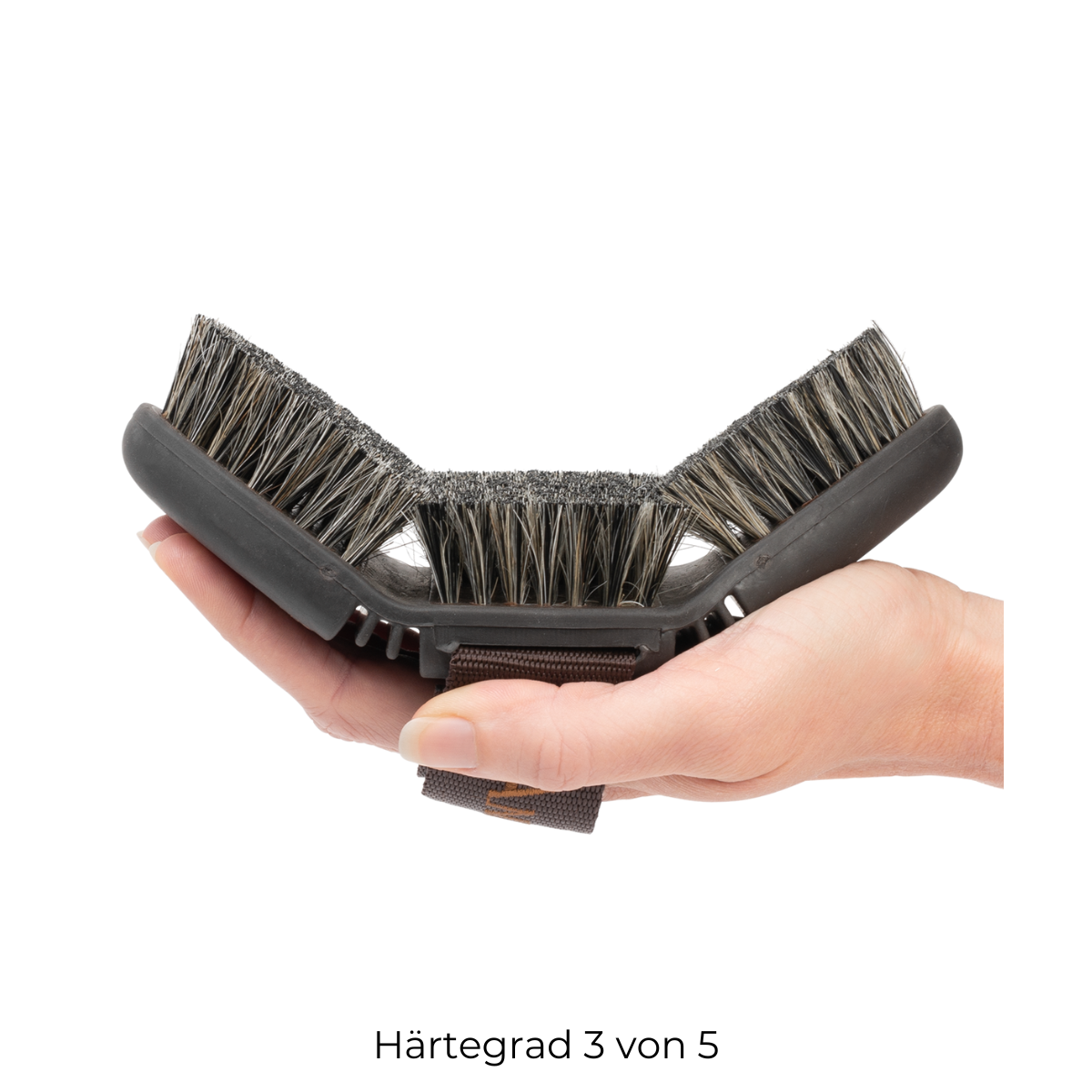 Die Wurzelbürste mit Naturborsten besetzt entfernt mühelos Schmutz und hartnäckigen Dreck und Haare aus dem Fell deines Pferdes.
