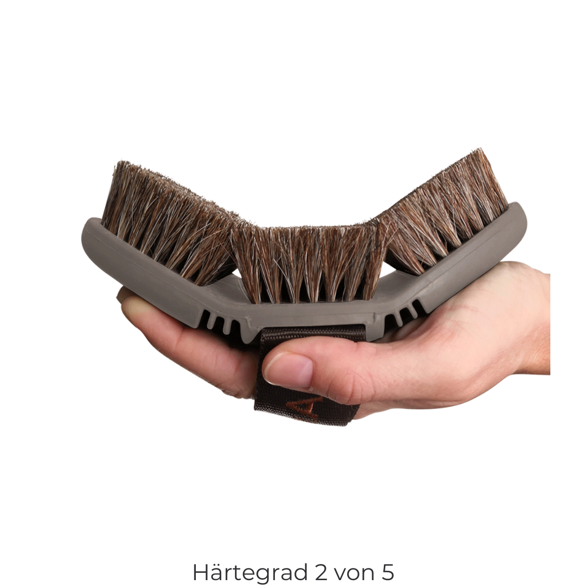 Die Wurzelbürste besteht aus Naturborsten und ist die Bürste mit der größten Stärke in unserem Sortiment. Sie ist also gemacht um den groben Schmutz vom Pferd zu entfernen. Ist dein Pferd nur empfindlich bei Kunststoffbürsten und die Stärke macht ihm/ihr nichts aus, dann ist die Bürste optimal für euch. Manche Pferde mögen aber harte Bürsten nicht so gern, dann ist die Wurzelbürste vermutlich eher weniger geeignet. Da würden wir euch eher die Natur Kardätsche empfehlen.